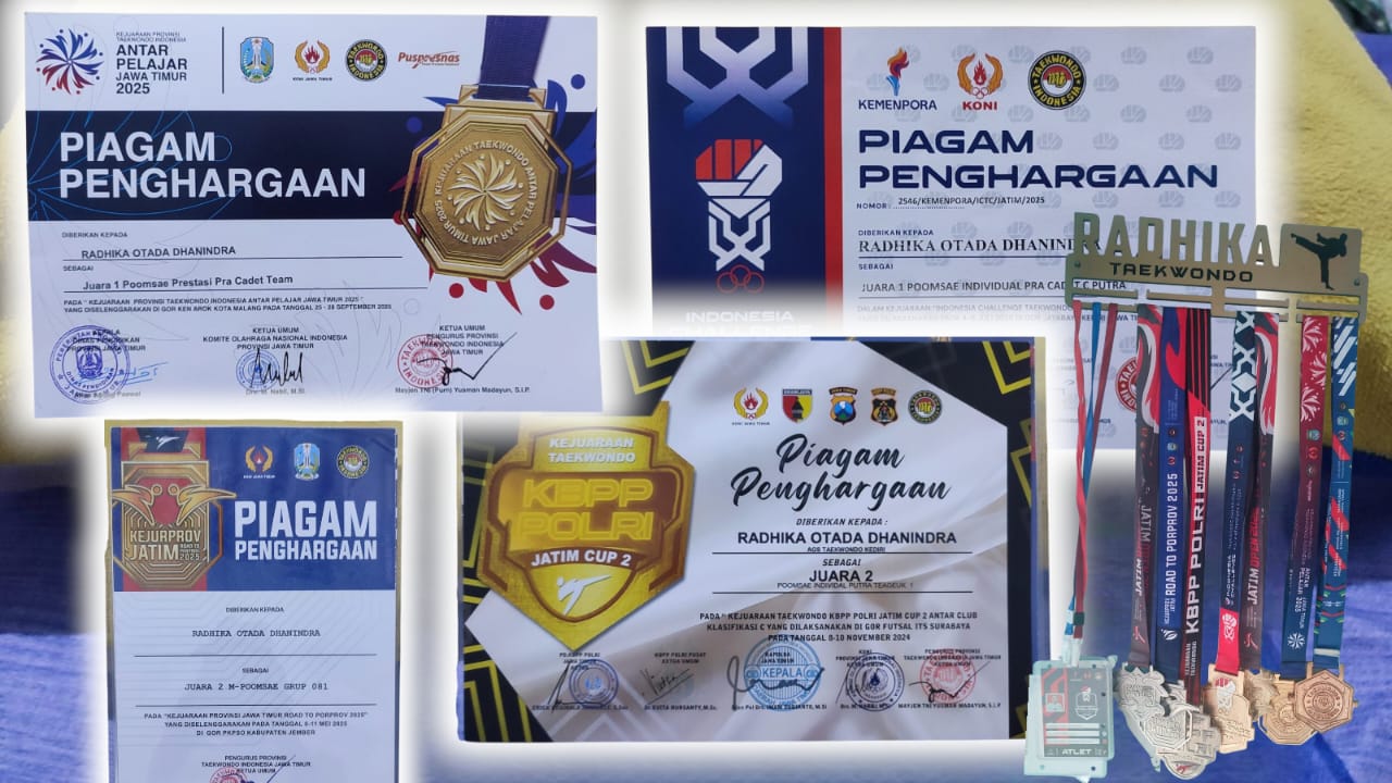 KEDIRI (aksennews.com) — Prestasi membanggakan kembali ditorehkan oleh atlet muda berbakat asal Kota Kediri, Radhika Otada Dhanindra, siswa SDI Al-Huda 2 Kota Kediri. Putra dari pasangan Sandhi Dhanindra dan Yuni Suryaningsih ini sukses meraih sejumlah gelar bergengsi di berbagai kejuaraan taekwondo sepanjang tahun 2024–2025.