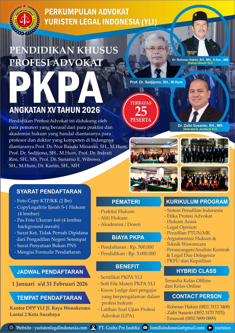 Kabar gembira bagi Anda! Perkumpulan Advokat Yuristen Legal Indonesia atau YLI kini resmi membuka pendaftaran Pendidikan Khusus Profesi Advokat atau PKPA Angkatan ke-15 Tahun 2026.