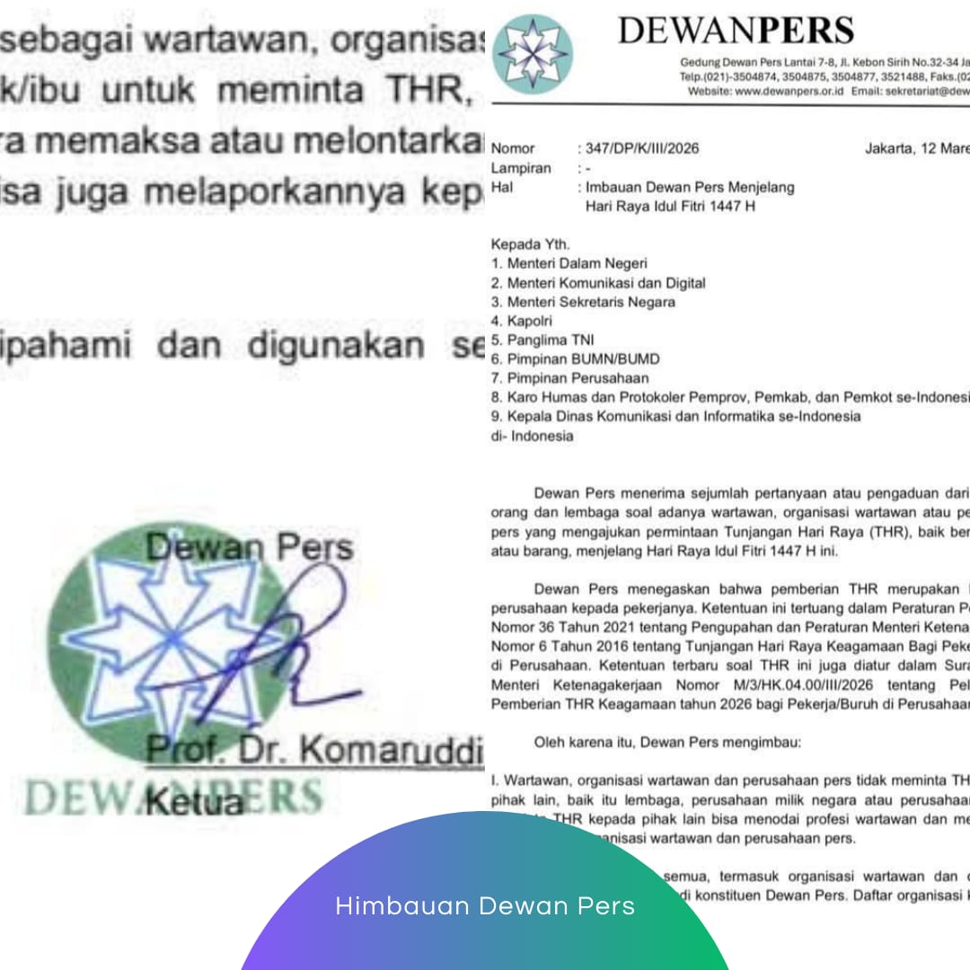 AKSENNEWS – Dewan Pers secara resmi mengeluarkan surat imbauan menjelang Hari Raya Idul Fitri 1447 H guna menjaga integritas dan profesionalisme pers nasional. Melalui surat bernomor 347/DP/K/III/2026, lembaga pengawal kebebasan pers ini meminta seluruh pimpinan instansi pemerintah, BUMN/BUMD, hingga perusahaan swasta untuk tidak melayani permintaan Tunjangan Hari Raya (THR) dari pihak yang mengaku sebagai wartawan atau organisasi pers.